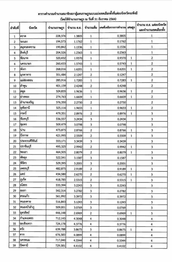 สำนักงานคณะกรรมการการเลือกตั้งพิจารณาแล้วเห็นว่า รัฐธรรมนูญแห่งราชอาณาจักรไทยแก้ไขเพิ่มเติม (ฉบับที่ 1 พุทธศักราช 2564๒๕๖๔ ได้กำหนดให้มีสมาชิกสภาผู้แทนราษฎรซึ่งมาจากการเลือกตั้งแบบแบ่งเขตเลือกตั้ง จำนวน 400 คน และการกำหนดจำนวนสมาชิกสภาผู้แทนราษฎรที่แต่ละจังหวัดจะพึงมีให้ใช้จำนวนราษฎรทั้งประเทศตามหลักฐานการทะเบียนราษฎรที่ประกาศในปีสุดท้าย ก่อนปีที่มีการเลือกตั้งเฉลี่ยด้วยจำนวนสมาชิก สภาผู้แทนราษฎร 400 คน ซึ่งสำนักงานคณะกรรมการการเลือกตั้งได้คำนวณจำนวนสมาชิกสภาผู้แทนราษฎร แบบแบ่งเขตเลือกตั้งที่แต่ละจังหวัดจะพึงมีแล้ว รายละเอียดปรากฏตามสิ่งที่ส่งมาด้วย 2