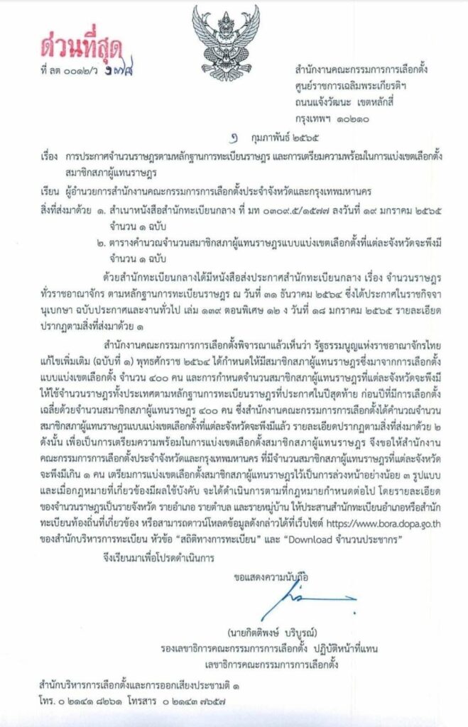 เมื่อวันที่ 1 กุมภาพันธ์ นายกิตติพงษ์ บริบูรณ์ รองเลขาธิการคณะกรรมการการเลือกตั้ง ปฏิบัติหน้าที่แทน เลขาธิการคณะกรรมการการเลือกตั้ง ได้มีหนังสือด่วนที่สุด ที่ ลด 0012/ว178 ลงวันที่ 1 ก.พ.65 สำนักงานคณะกรรมการการเลือกตั้ง เรื่อง การประกาศจำนวนราษฎรตามหลักฐานการทะเบียนราษฎร และการเตรียมความพร้อมในการแบ่งเขตเลือกตั้งสมาชิกสภาผู้แทนราษฎร เรียน ผู้อำนวยการสำนักงานคณะกรรมการการเลือกตั้งประจำจังหวัดและกรุงเทพมหานคร