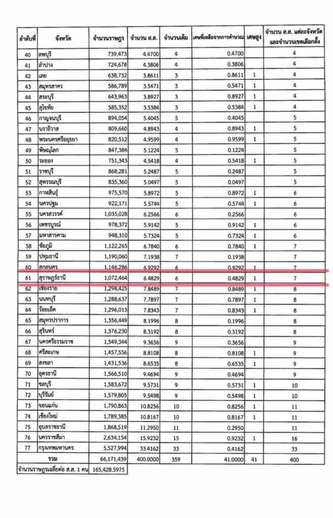 ข่าวแจ้งว่า จำนวนราษฎร ณ วันที่ 31 ธ.ค.65 จำนวน 66,171,439 คน กกต.ใช้เกณฑ์เฉลี่ยราษฎร จำนวน 165,428.5975 คน ต่อ ส.ส.1 คน จึงมี ส.ส.จากเดิม 359 คน เพิ่ม 41 คนใน 41 จังหวัด รวมจำนวน ส.ส.400 คน จำนวนเขตเลือกตั้ง 400 เขต เช่น จังหวัดสนามเลือกตั้งใหญ่ จ.นครราชสีมา ได้ ส.ส.เพิ่มเป็น 16 คน เชียงใหม่ ขอนแก่น เพิ่ม 11 คน บุรีรัมย์ ชลบุรี 10 คน และสนามเล็ก ชัยนาท นครนายก พังงา แม่ฮ่องสอน สตูล อ่างทอง อุทัยธานี ได้เพิ่มเป็น 2 คน เป็นต้น