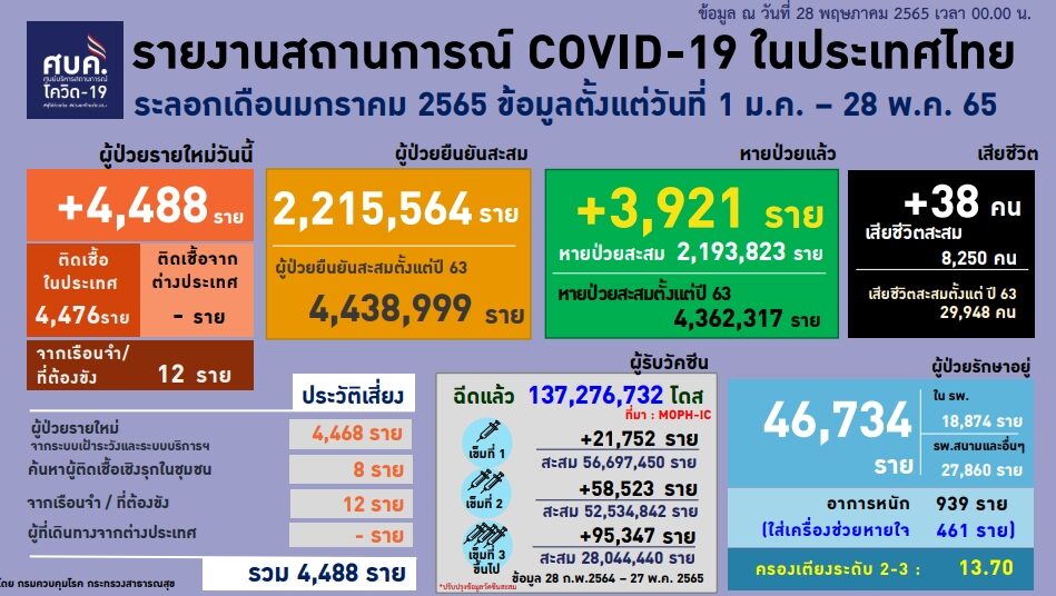 เมื่อวันที่ 28 พฤษภาคม ผู้สื่อข่าวรายงานว่า ศูนย์บริหารสถานการณ์การแพร่ระบาดของโรคติดเชื้อไวรัสโคโรนา 2019 (โควิด-19) (ศบค.) รายงานสถานการณ์การแพร่ระบาดของโควิด-19 ในประเทศไทย ว่า วันนี้พบผู้ติดเชื้อรายใหม่ 4,488 ราย จำแนกเป็นผู้ติดเชื้อรายใหม่ 4,486 ราย ค้นหาเชิงรุกในชุมชน 8 ราย ติดเชื้อจากผู้เดินทางต่างประเทศไม่มี และติดเชื้อในเรือนจำ/ที่ต้องขังเพิ่ม 12 ราย ผู้ป่วยยืนยันสะสม 2,215,564 ราย ผู้ป่วยยืนยันสะสมตั้งแต่ปี 2563 4,438,999 ราย หายป่วยเพิ่มวันนี้ 3,921 ราย หายป่วยสะสม 2,193823 ราย หายป่วยสะสมตั้งแต่ปี 2563 4,362,317 ราย วันนี้มีผู้เสียชีวิต 38 คน เสียชีวิตสะสม 8,250 คน เสียชีวิตสะสมตั้งแต่ปี 2563 รวม 29,948 ราย ส่วนผู้ป่วยรักษาอยู่ 46,734 ราย แบ่งเป็นรักษาในโรงพยาบาล 18,876 ราย โรงพยาบาลสนามและอื่นๆ 27,860 ราย อาการหนัก 939 ราย และใส่เครื่องช่วยหายใจ 461 ราย ครองเตียงระดับ 2-3 13.70%