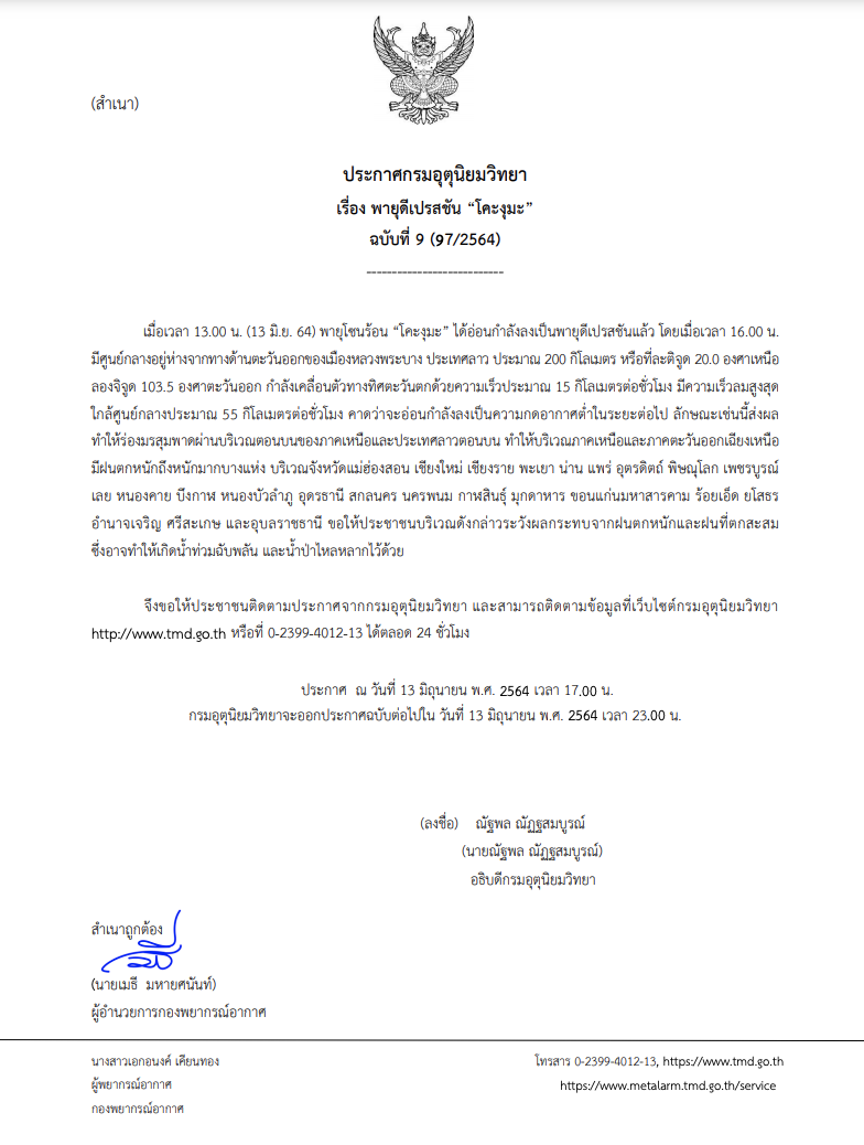 เมื่อวันที่ 13 มิถุนายน กรมอุตุนิยมวิทยา ได้ออกประกาศเรื่อง “พายุดีเปรสชัน “โคะงุมะ” “ฉบับที่ 9 ลงวันที่ 13 มิถุนายน 2564 ระบุว่า