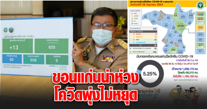 เมื่อวันที่ 28 มิถุนายน 2564 ผู้สื่อข่าวประจำจังหวัดขอนแก่น ได้รายงานสถานการณ์โรค covid -19 ในพื้นที่ว่าจังหวัดขอนแก่น ว่าพบผู้ติดเชื้อโควิค- 19 รอบ 3 ระลอกใหม่ ซึ่งเมื่อวาน มีผู้ติดเชื้อโควิคจำนวน 13 ราย โดยในวันนี้ มีผู้ติดเชื้อเพิ่ม 17 ราย มีรายละเอียดดังนี้ อำเภอสีชมพู จำนวน 7 ราย,อำเภอมัญจาคีรี 1 ราย,อำเภอพล 1 ราย,อำเภอโคกโพธิ์ไชย 2 ราย,อำเภอหนองสองห้อง 1 ราย, อำเภอภูเวียง 1 ราย และมาจากต่างจังหวัด 4 ราย รายงาน ผลผู้ติดเชื้อ ณเวลา 16.30 น.ติดเชื้อสะสม 642 ราย กำลังรักษา 76 ราย รักษาหายรวม 561 ราย ยอดสะสมตั้งแต่วันที่ 1 เมษายน 2564 ข้อมูลสำนักงานสาธารณสุขจังหวัดขอนแก่น