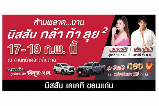 “นิสสัน กล้า ท้า ลุย ยกกำลังสอง” ยกขบวนนิสสัน นาวารา รถกระบะที่กล้าเพื่อคนแกร่ง สุด หล่อ แรง ล้ำ และ นิสสัน เทอร์ร่า ใหม่ รถเอสยูวีสำหรับทุกคนในครอบครัว สู่เมืองเสียงแคนดอกคูน จังหวัดขอนแก่นและพื้นที่ใกล้เคียง เชิญชวนร่วมกิจกรรมและทดสอบรถยนต์นิสสันรุ่นยอดนิยม ภายในงานระหว่างวันที่ 17 – 19 กุมภาพันธ์ 2565 เวลา 11.00 น. – 21.00 น. ที่ลานกิจกรรมตลาดต้นตาล จังหวัดขอนแก่น ตามรายละเอียดของกิจกรรมดังนี้