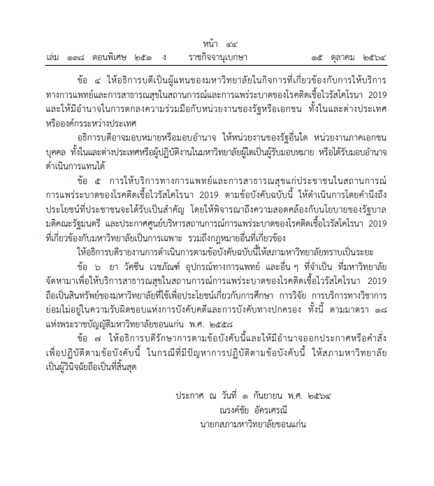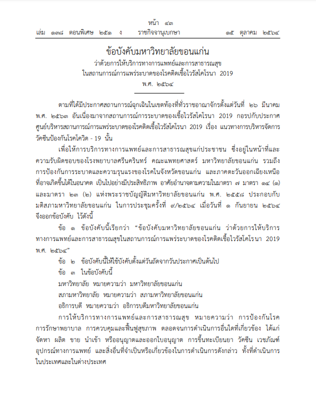 วันที่ 17 ตุลาคม 2564 ผู้สื่อข่าวรายงานว่า เว็บไซต์ราชกิจจานุเบกษา เผยแพร่ประกาศ ข้อบังคับมหาวิทยาลัยขอนแก่น ว่าด้วยการให้บริการทางการแพทย์และการสาธารณสุข ในสถานการณ์การแพร่ระบาดของโรคติดเชื้อไวรัสโคโรนา 2019 พ.ศ. 2564 เมื่อวันที่ 15 ตุลาคมที่ผ่านมา ความว่า