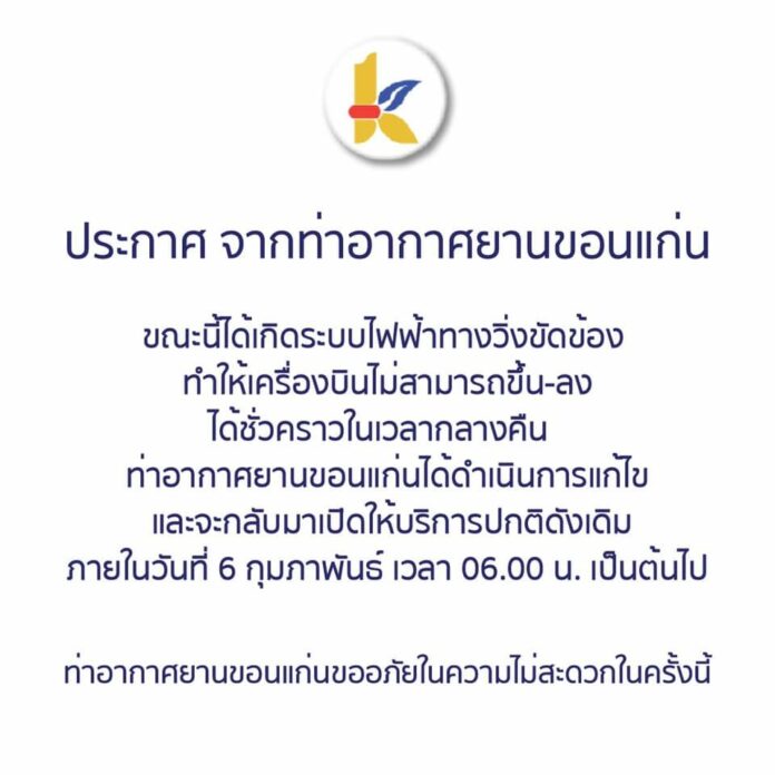 วุ่น! สนามบินขอนแก่น ยกเลิกเที่ยวบินไฟท์กลางคืนหมด หลังไฟรันเวย์ขัดข้อง ฝ่ายนิรภัยมีมิให้งดทำการบินตามมาตรฐานความปลอดภัยสูงสุด