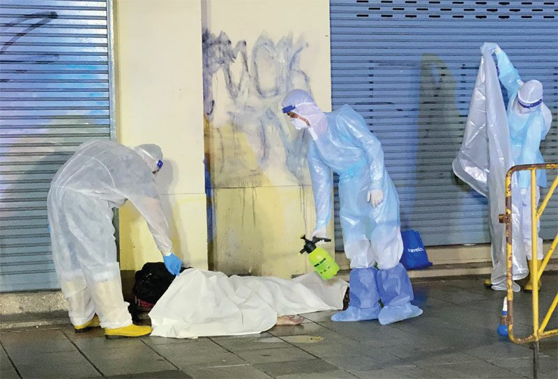 ข้างถนน – ศพชายติดโควิด นอนเสียชีวิตอยู่ริมถนนราชดำเนินกลาง หน้าศึกษาภัณฑ์ เขตพระนคร กทม. ตั้งแต่ช่วงเช้ากระทั่งค่ำจึงมี เจ้าหน้าที่ชุดเฉพาะกิจเข้ามาเก็บศพ ทั้งนี้วันเดียวกันยังพบผู้เสียชีวิตข้างถนนอีก 3 ราย เมื่อ 20 ก.ค.