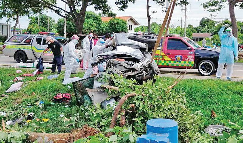 เคราะห์ซ้ำ – ที่เกิดเหตุ 6 ผู้ป่วยโควิดชาวพะเยา ใช้รถกระบะเป็นพาหนะกลับไปรักษาตัวที่บ้านเกิด คนขับหลับในเสียหลักชนต้นไม้ ทำให้น.ส.วันเพ็ญ จอมภา และนางสายทอง วิระแสง เสียชีวิต ที่เหลือบาดเจ็บสาหัส ในจำนวนนี้มีเด็ก 2 คน ที่ถนนชัยนาท-สุพรรณบุรี อ.ศรีประจันต์ จ.สุพรรณบุรี เมื่อวันที่ 21 ก.ค.
