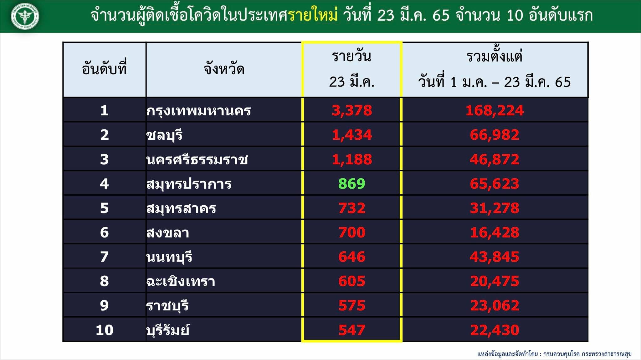 ส่วน 10 จังหวัดที่มีรายงานติดเชื้อรายใหม่สูงสุดคือ 1.กทม. 3,378 ราย 2.ชลบุรี 1,434 ราย 3.นครศรีธรรมราช 1,188 ราย 4.สมุทรปราการ 869 ราย 5.สมุทรสาคร 732 ราย 6.สงขลา 700 ราย 7.นนทบุรี 646 ราย 8.ฉะเชิงเทรา 605 ราย 9.ราชบุรี 575 ราย และ 10.บุรีรัมย์ 547 ราย