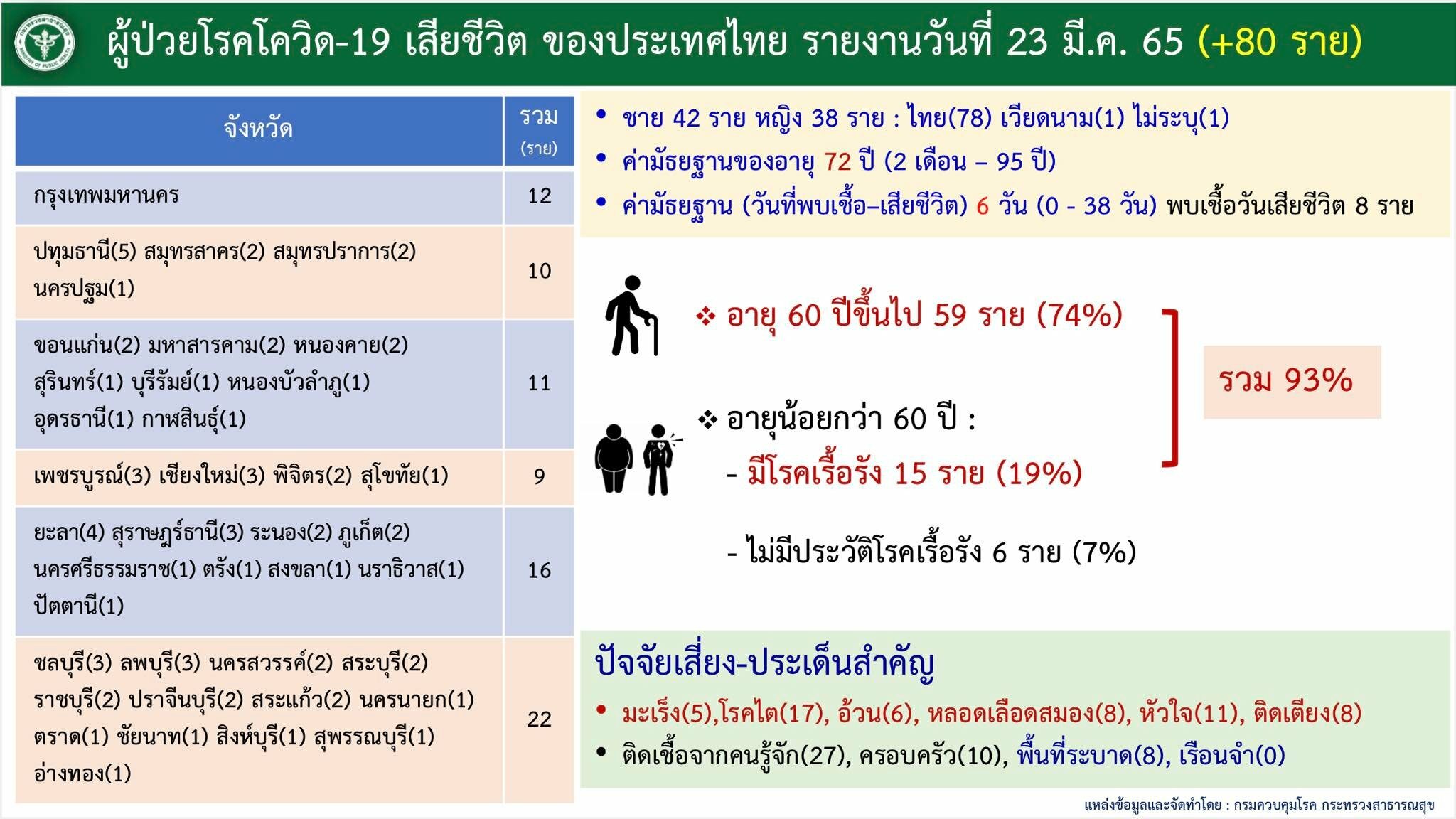 และ นครปฐม สุรินทร์ บุรีรัมย์ หนองบัวลำภู อุดรธานี กาฬสินธุ์ สุโขทัย นครศรีธรรมราช ตรัง สงขลา นราธิวาส ปัตตานี นครนายก ตราด ชัยนาท สิงห์บุรี สุพรรณบุรี และอ่างทอง จังหวัดละ 1 ราย เป็นชาย 42 ราย หญิง 38 ราย อายุ 2 เดือน – 95 ปี เฉลี่ย 72 ปี โดยเป็นผู้สูงอายุและโรคประจำตัวรวม 93%