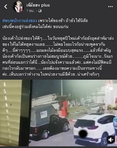 โดยระบุข้อความว่า ตบพนักงานส่งของเพราะได้ของช้า ถ้ายังใช้นิสัยเช่นนี้คงอยู่ร่วมสังคมไม่ได้ค่ะ ขอนแก่น น้องเขาไปส่งของให้ดี ๆ ในวันหยุดปีใหม่เขาก็ยังอุตส่าห์มาส่งของให้ไม่ได้หยุดงานเลย ไม่พอใจอะไรก็น่าจะพูดจากันดี ๆ นี่ด่าแถมลงไม้ลงมือแบบสุดแรง แล้วที่สำคัญน้องเขาก็เป็นคนร่างกายไม่สมบูรณ์ด้วย ภูมิใจเนอะรังแกคนที่อ่อนแอกว่าได้นี่ น้องไปแจ้งความแล้ว แต่คงไม่มีฟีดแบ็กอะไรกลับมาหรอก เลยต้องมาขอความเป็นธรรมทางนี้ เห็นบอกว่าทำงานในหน่วยงานมีสีด้วย
