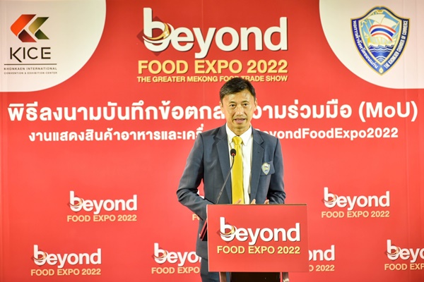 นายเจริญ แก้วสุกใส ประธานกลุ่มอุตสาหกรรมอาหาร สภาอุตสาหกรรมแห่งประเทศไทย ประธานในพิธีการลงนามข้อตกลงความร่วมมือ (MoU) ระหว่างหอการค้าจังหวัดขอนแก่นและศูนย์ประชุมและแสดงสินค้านานาชาติขอนแก่น (ศูนย์ประชุมฯ ไคซ์) จัดงาน BEYOND FOOD EXPO 2022 (บียอนด์ ฟู้ด เอกซ์โปร์) งานแสดงสินค้าอาหารและเครื่องดื่มระดับภูมิภาคประจำอนุภูมิภาคแม่น้ำโขง (กลุ่มประเทศ GMS อันได้แก่ ไทย ลาว พม่า กัมพูชา เวียดนาม และจีน-ยูนนาน) นำเสนอสินค้านวัตกรรมด้านอาหาร การแปรรูป การบรรจุภัณฑ์ และการขนส่ง แบบครบวงจร เพื่อชูศักยภาพและยกระดับเศรษฐกิจในระดับอนุภูมิภาค สู่ระดับนานาชาติ ผ่านโปรแกรมจับคู่ทางธุรกิจ “Hosted Buyer Program” ผลักดันภาคการส่งออกของอุตสาหกรรมอาหารไทยให้เป็น ครัวของโลก คาดการณ์มูลค่าการส่งออกทั้งปี 1.20 ล้านล้านบาท ขยายตัว 9.3% มีปัจจัยบวกจากประเทศคู่ค้าที่ต้องการสินค้าอาหารเพิ่มขึ้น
