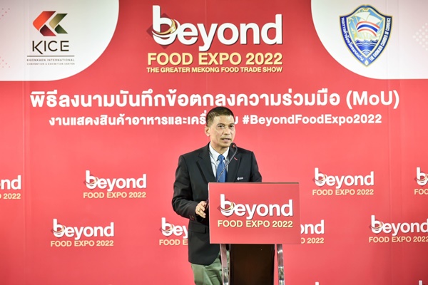 นายเจริญ แก้วสุกใส ประธานกลุ่มอุตสาหกรรมอาหาร สภาอุตสาหกรรมแห่งประเทศไทย ประธานในพิธีการลงนามข้อตกลงความร่วมมือ (MoU) ระหว่างหอการค้าจังหวัดขอนแก่นและศูนย์ประชุมและแสดงสินค้านานาชาติขอนแก่น (ศูนย์ประชุมฯ ไคซ์) จัดงาน BEYOND FOOD EXPO 2022 (บียอนด์ ฟู้ด เอกซ์โปร์) งานแสดงสินค้าอาหารและเครื่องดื่มระดับภูมิภาคประจำอนุภูมิภาคแม่น้ำโขง (กลุ่มประเทศ GMS อันได้แก่ ไทย ลาว พม่า กัมพูชา เวียดนาม และจีน-ยูนนาน) นำเสนอสินค้านวัตกรรมด้านอาหาร การแปรรูป การบรรจุภัณฑ์ และการขนส่ง แบบครบวงจร เพื่อชูศักยภาพและยกระดับเศรษฐกิจในระดับอนุภูมิภาค สู่ระดับนานาชาติ ผ่านโปรแกรมจับคู่ทางธุรกิจ “Hosted Buyer Program” ผลักดันภาคการส่งออกของอุตสาหกรรมอาหารไทยให้เป็น ครัวของโลก คาดการณ์มูลค่าการส่งออกทั้งปี 1.20 ล้านล้านบาท ขยายตัว 9.3% มีปัจจัยบวกจากประเทศคู่ค้าที่ต้องการสินค้าอาหารเพิ่มขึ้น