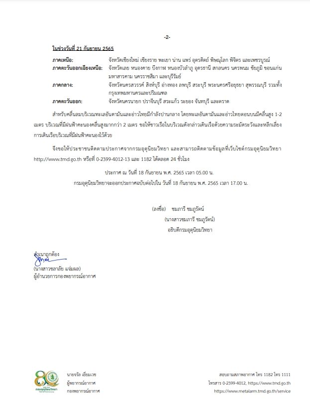 เมื่อวันที่ 18 กันยายน น.ส.ชมภารี ชมภูรัตน์ อธิบดีกรมอุตุนิยมวิทยา เผยแพร่ประกาศกรมอุตุนิยมวิทยา “ฝนตกหนักถึงหนักมากบริเวณประเทศไทย (มีผลกระทบตั้งแต่วันที่ 18-21 กันยายน 2565)” ฉบับที่ 6 ลงวันที่ 18 กันยายน 2565 โดยมีรายละเอียด ดังนี้