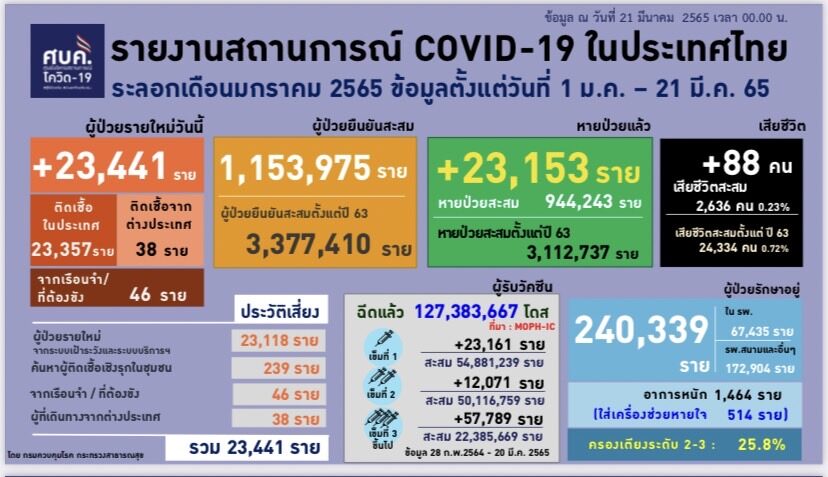 สำหรับประเทศไทย วันนี้พบผู้ติดเชื้อรายใหม่ 23,441 ราย ติดเชื้อในประเทศ 23,118 ราย ติดเชื้อจากต่างประเทศ 38 ราย จากเรือนจำและที่ต้องขัง 46 ราย
