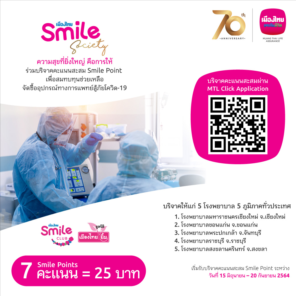 สมาชิกฯ ใช้คะแนนสะสม Smile Point ทุก 7 คะแนน ซึ่งจะมีมูลค่าเท่ากับ 25 บาท เพื่อบริจาคเงินสมทบทุนซื้ออุปกรณ์ทางการแพทย์ให้แก่โรงพยาบาลละ 200,000 บาท จำนวน 5 แห่ง รวมเป็นเงินทั้งสิ้น 1,000,000 บาท ทั้งนี้ หากสมาชิกฯ มีการบริจาคคะแนนสะสม Smile Points ตั้งแต่ 150 คะแนน มูลค่าเท่ากับ 525 บาท เป็นต้นไป