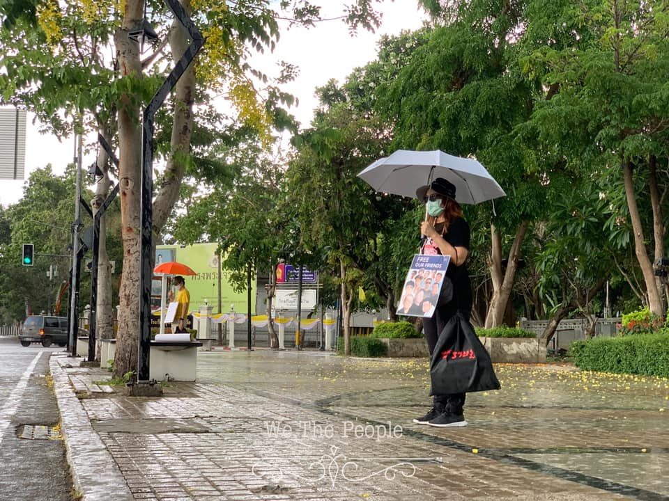 สำหรับวันนี้มีบุคคลที่มีชื่อเสียง อาทิ อ.ชำนาญ จันทร์เรือง สมาชิกคณะ ก้าวหน้า มาร่วมยืนด้วย และมีผู้ที่ร่วมโกนศีรษะประท้วงมาร่วมยืนจำนวน 2 คน ท่ามกลางพายุฝน ที่กระหน่ำลงมาอย่างหนัก กระทั่งชุดเปียกโชก บางรายสาวมชุดกันฝน บางรายกางร่มลายหมุดคระราษฎร บางรายยืนท่ามกลางสายฝน ด้านเจ้าหน้าตำรวจทั้งในและนอกเครื่องแบบคอยสังเกตการณ์โดยรอบ