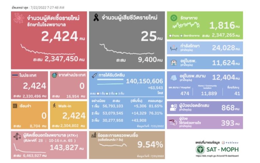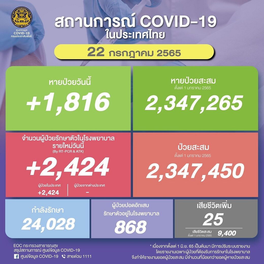 เมื่อวันที่ 22 กรกฎาคม สถานการณ์แพร่ระบาดของโควิด-19 ประจำวัน ศูนย์บริหารสถานการณ์การแพร่ระบาดของโรคติดเชื้อไวรัสโคโรนา 2019 หรือ ศบค.รายงานสถานการณ์การแพร่ระบาดของโรคติดเชื้อไวรัสโคโรนา 2019 ผู้ป่วยรายใหม่ (รักษาตัวใน รพ.) จำนวน 2,424 ราย จำแนกเป็น ผู้ป่วยในประเทศ 2,424 ราย ผู้ป่วยมาจากต่างประเทศ – ราย ผู้ป่วยสะสม 2,347,450 ราย (ตั้งแต่ 1 มกราคม 2565) หายป่วยกลับบ้าน 1,816 ราย หายป่วยสะสม 2,347,265 ราย (ตั้งแต่ 1 มกราคม 2565) ผู้ป่วยกำลังรักษา 24,028 ราย เสียชีวิต 25 ราย เสียชีวิตสะสม 9,400 ราย (ตั้งแต่ 1 มกราคม 2565) จำนวนผู้ป่วยปอดอักเสบ รักษาตัวอยู่ในโรงพยาบาล 868 ราย