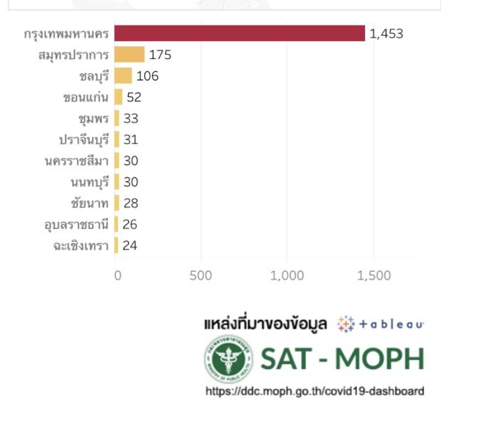 ขณะที่ ผู้ป่วยอาการหนักใช้ท่อช่วยหายใจ 393 ราย ผู้ป่วยปอดอักเสบ 868 ราย โดยจังหวัดที่มีจำนวนผู้ติดเชื้อสูงสุด ได้แก่ กรุงเทพฯ สมุทรปราการ ชลบุรี ขอนแก่น ชุมพร ปราจีนบุรี นครราชสีมา นนทบุรี ชัยนาท อุบลราชธานี และฉะเชิงเทรา